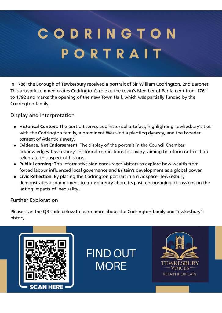 We are delighted to share that at Full Council in September 2025, Tewkesbury Town Council approved a new freestanding display in the Council Chamber. The display, featuring a QR code, highlights the Codrington family’s links to the transatlantic slave trade.