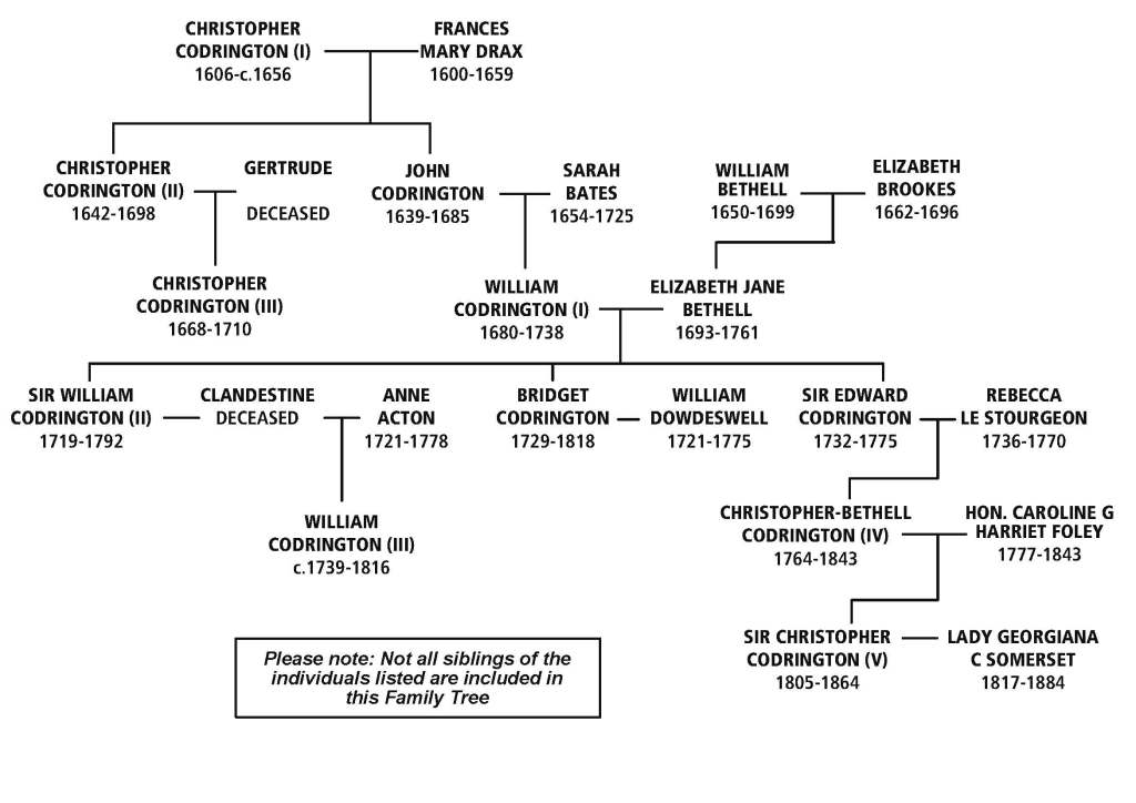 Christopher Codrington (III) (1668-1710), did not marry and have issue, so he was succeeded by his Uncle John Codrington. He was father to William Codrington (I) (1680-1738) who was created the 1st hereditary Baronet in 1721. His bride was a wealthy slave-owning Bethell. Aristocratic marriages were then inspired firstly by wealth rather than love.